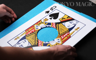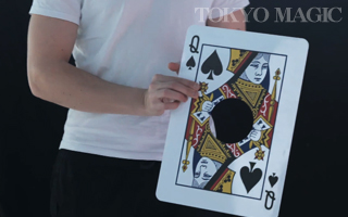 手を当てると黒い部分が完全な丸い空間となり、スルリと腕が貫通。 黒い部分のシールを剥がすと、穴は塞がれ元の1枚のカードに復元します。