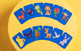 動物トランプの中から1枚の動物トランプを選んでもらい、「クレイジー ルースター」の箱に入れます。でも、鶏には羽根が必要ですよね?鮮やかな羽根をひとつかみ取り、箱の中にまき散らして魔法で「孵化」させます。