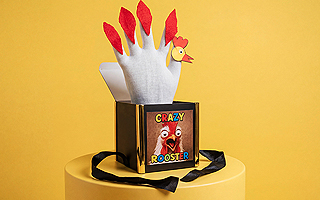 すると突然、蓋がパカッと開き、大きくてコミカルな鶏が箱から飛び出し、くちばしに選ばれたトランプをくわえています!