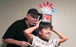 蓋を閉めて、子供をアシスタントにして頭の上で箱を空高く掲げてもらいます。付属の魔法のエアチューブを掴み、深呼吸をして「プッ!」と息を吹き込みます!