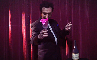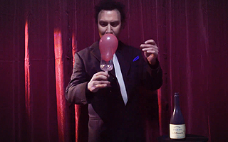 片手にシルクの入ったエレガントな透明グラスを見せて、シルクを取り出して、片手でシルクを小さくして手に握りこんで、空中に振ると鮮やかにシルクが消えます。次に、グラスの中に風船を入れます。