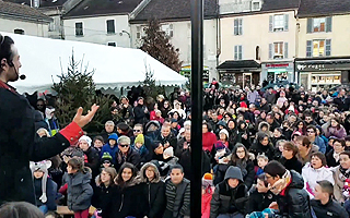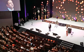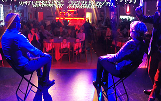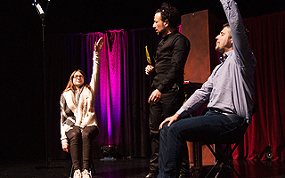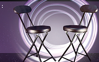 ステージ上で2人の観客に、ある体験をプレゼントします。2人とも椅子に座り、ステージの両側に2-3m離れた場所に座り、目隠しをします。