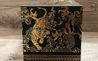 ※コットンペーパー製の特別なボックスには、黒と金の箔押しと深みのあるエンボス加工が施され、六道が連続的に描かれています。