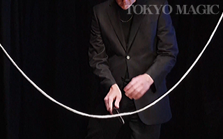2人の観客にロープの両端を持ってもらい、中心近くにたるみを取ってロープを切断します。その切断箇所の端と端を結んで結び目を作りロープを一直線にします。次に、結び目をロープに沿って自由に滑らせてしまいます。切断した部分が不思議なことに左右に動きます。