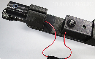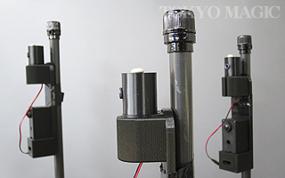 3脚式のスタンドの上部に固定クリップを挟んで、システムのモーターをビニールテープかゴムなどで固定させます。一般的なステージではスタンドを左右両サイドの袖口に立てて使います。