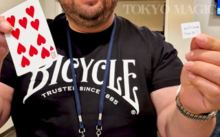 カードケースから予言のメモを放り出すと、観客が選んだカードと正確に一致しています。しかし、このマジックはこれからドラマチックな手の平にインクで書かれた予言へと展開します。