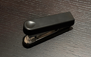 観客からお札を借ります。2枚のカードを選んでもらい、カードを背中合わせに重ね、借りたお札をカードの間に挟み、ホッチキスで3枚を留めます。