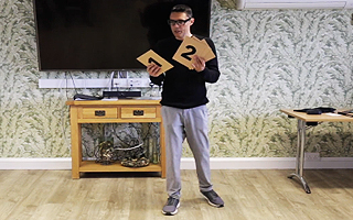 ランダムに選ばれた観客が紙幣を1枚選び、封筒に入れて首から下げます。裏面に大きな×印が付いたプレースマット4枚がステージ上に置かれ、4人のボランティアが参加します。各ボランティアはプレースマットの後ろのどこに立つかを選択します。