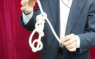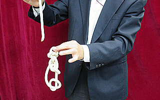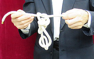 ポケットから1本のロープを出して、両端を絡めて中央に結び目を作ります。1個くらいの結び目を消すのは簡単。さらに結んで2個目の結び目。それでもこの位なら分けなく消せます。何といってもマジックです。