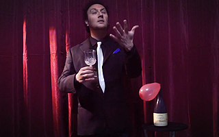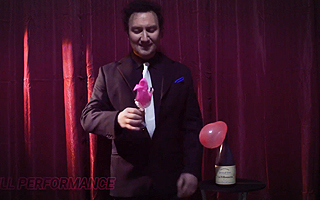 片手にシルクの入ったエレガントな透明グラスを見せて、シルクを取り出して、片手でシルクを小さくして手に握りこんで、空中に振ると鮮やかにシルクが消えます。次に、グラスの中に風船を入れます。