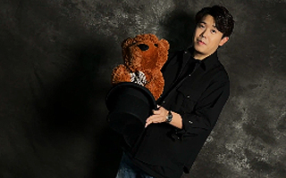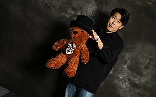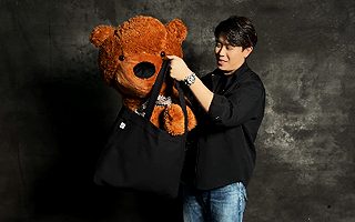 ※布バックをショルダーにかけて登場、中から巨大なテディベアが出現。