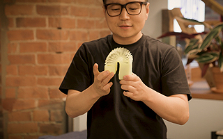 スリンキーを伸ばしたり、弾ませたりして見せます。手のひらに置いたスリンキーを軽く振って裏返すと、コイルの中から突然、一組のトランプが出現します。