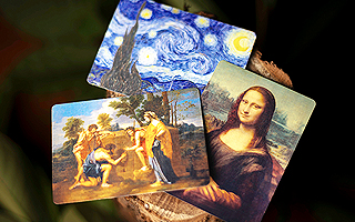 デックは、USPC社製の高級バイスクル用紙に印刷されており、耐久性と美しい操作性を備えています。カードには、歴史に名を残す巨匠たちのサイン入り名画が描かれたアートカードが10枚付属しています。
