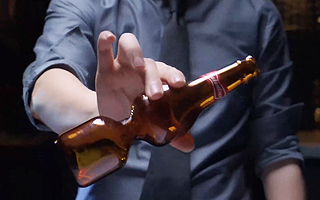 ボトルキャップをボトルの底から貫通させるという、ありえないトリックを見せたその後です。まさに視覚的な魔法です。キャップが中に入ったままで瓶の上下を左右の手で掴んで、渦巻の形に胴体をねじってしまいます。