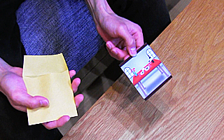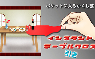 昭和・平成の国民的なお正月番組「スターかくし芸大会」で大人気となった「テーブルクロス引き」をイメージした「インスタントテーブルクロス引き」。絵の中から赤いクロスが飛び出してきます。目の前で見せられます。