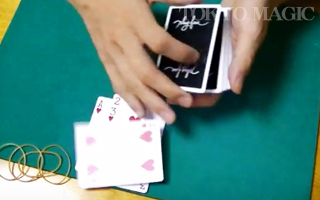 レパートリーにしておきたい圧巻のカードルーティン、準備は輪ゴムが1本と一組のデックだけです。輪ゴムがなければ一組のデックだけでも演じられます。